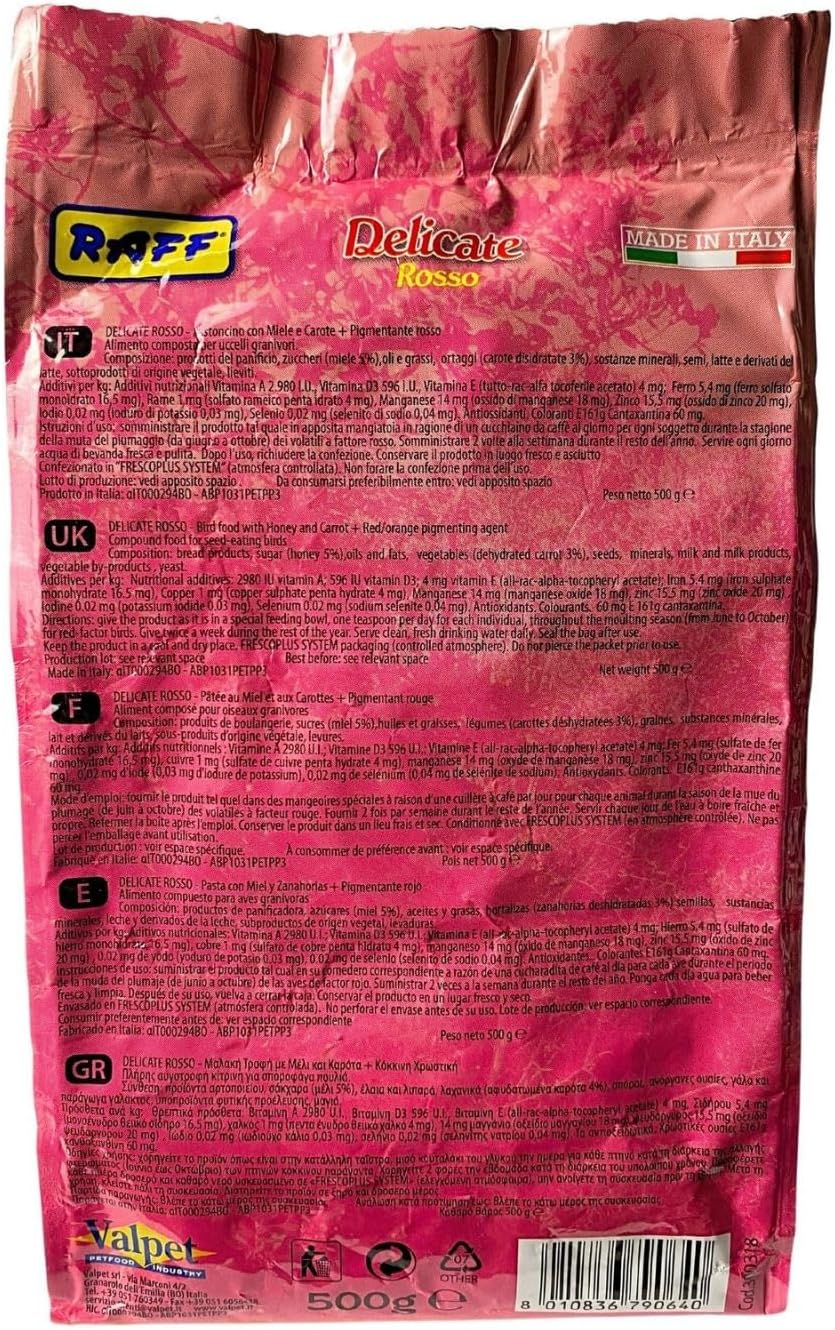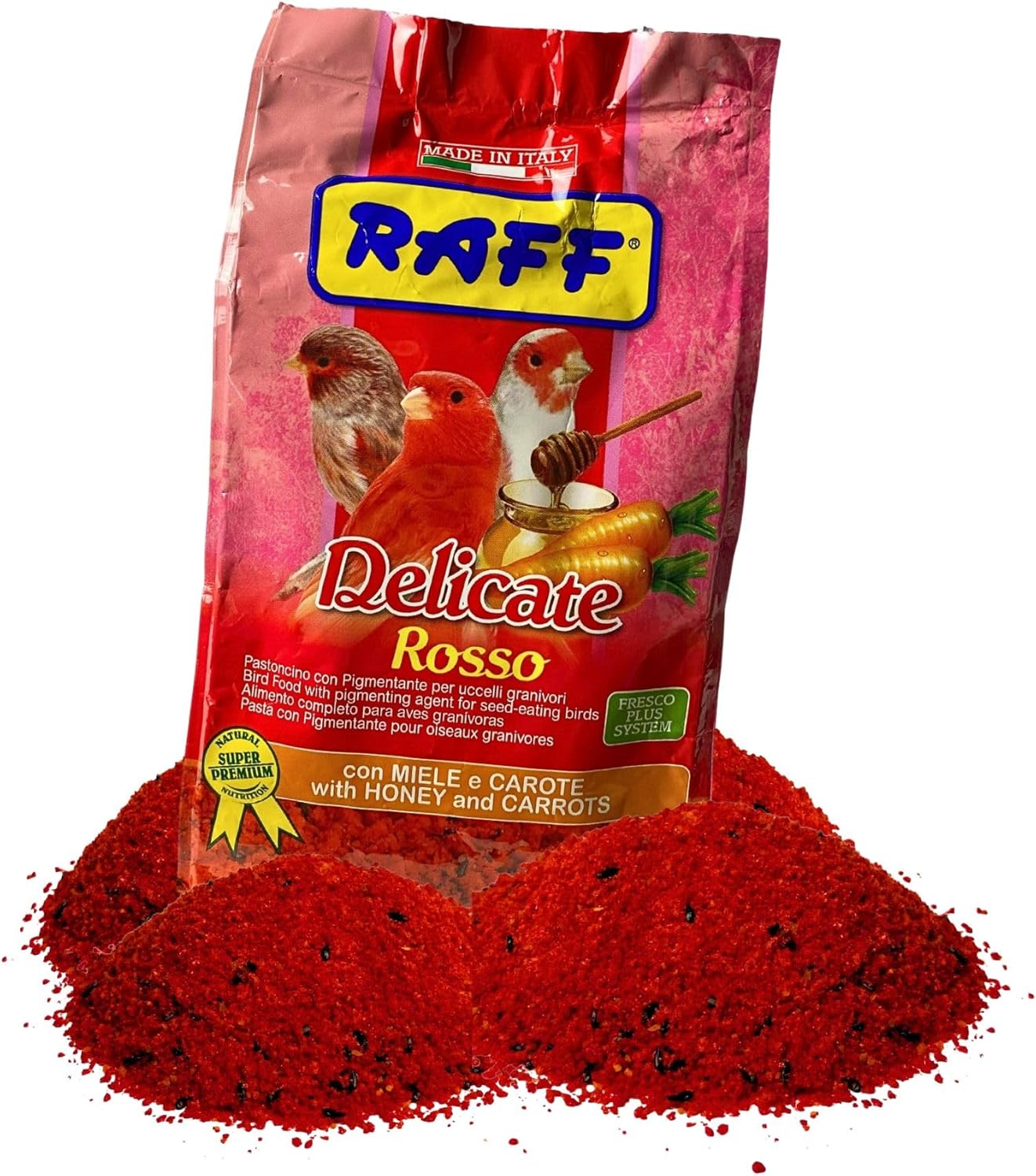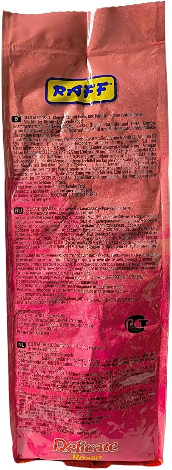 Elevate the natural beauty of your avian companions with Raff Delicate Rosso, a moist red breeding stock, meticulously crafted and designed explicitly for canaries and granivorous birds. Enriched with carotenoids, this specialized formula is dedicated to enhancing and illuminating the red tones of its plumage. This delicately formulated paste features appetizing food coloring, incorporating a rich honey-infused composition.