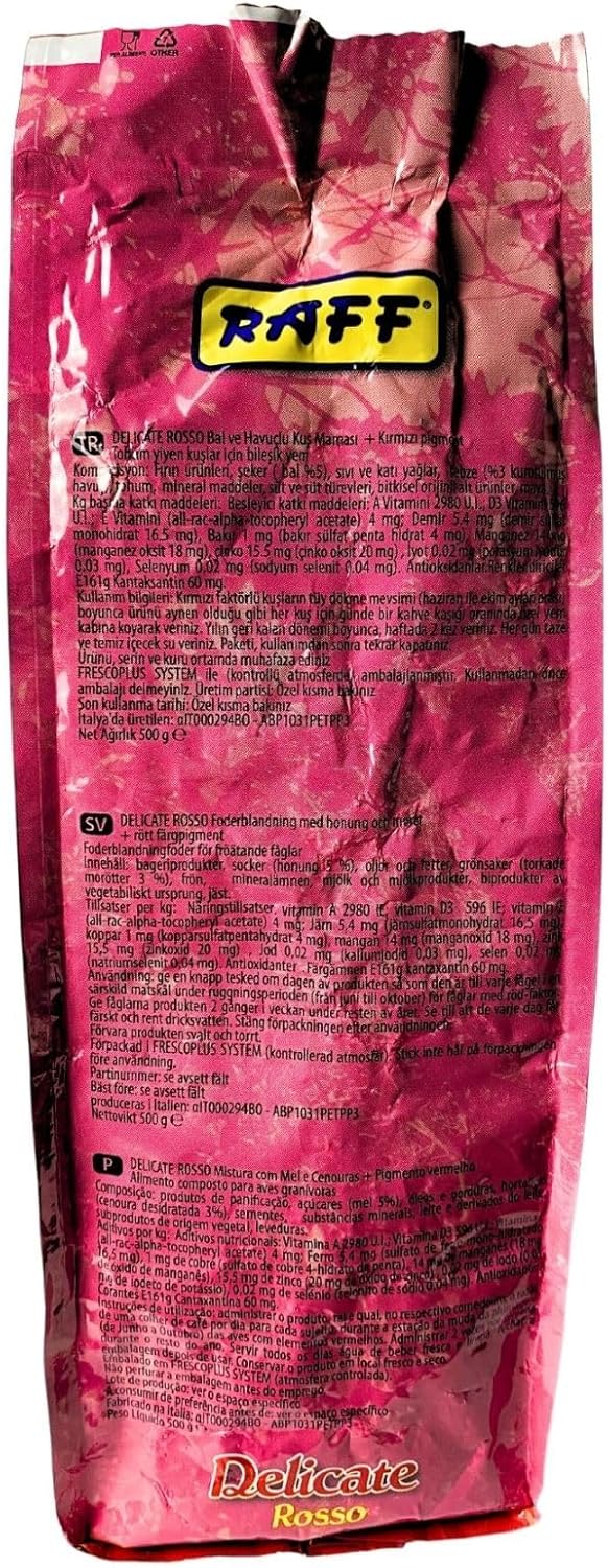 Trust the long-standing reputation of Delicate Rosso, known for its smoothness, palatability and its constant supply of optimal nutrition. Enjoy the peace of mind that comes with providing a diet that not only supports your birds' health and digestion, but also improves and maintains the captivating color of their plumage, ensuring they stand out for their natural beauty. Take home Raff Delicate Rosso today and gift your birds an unparalleled experience, making their lives vibrant and visually stunning.