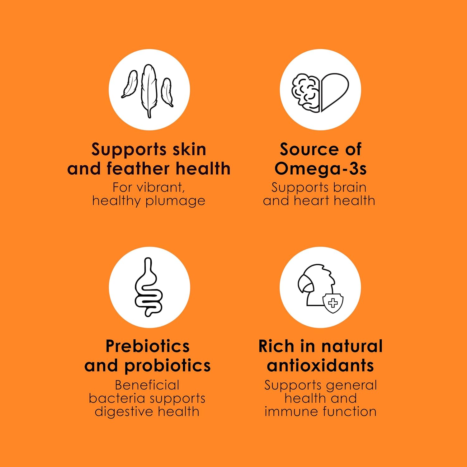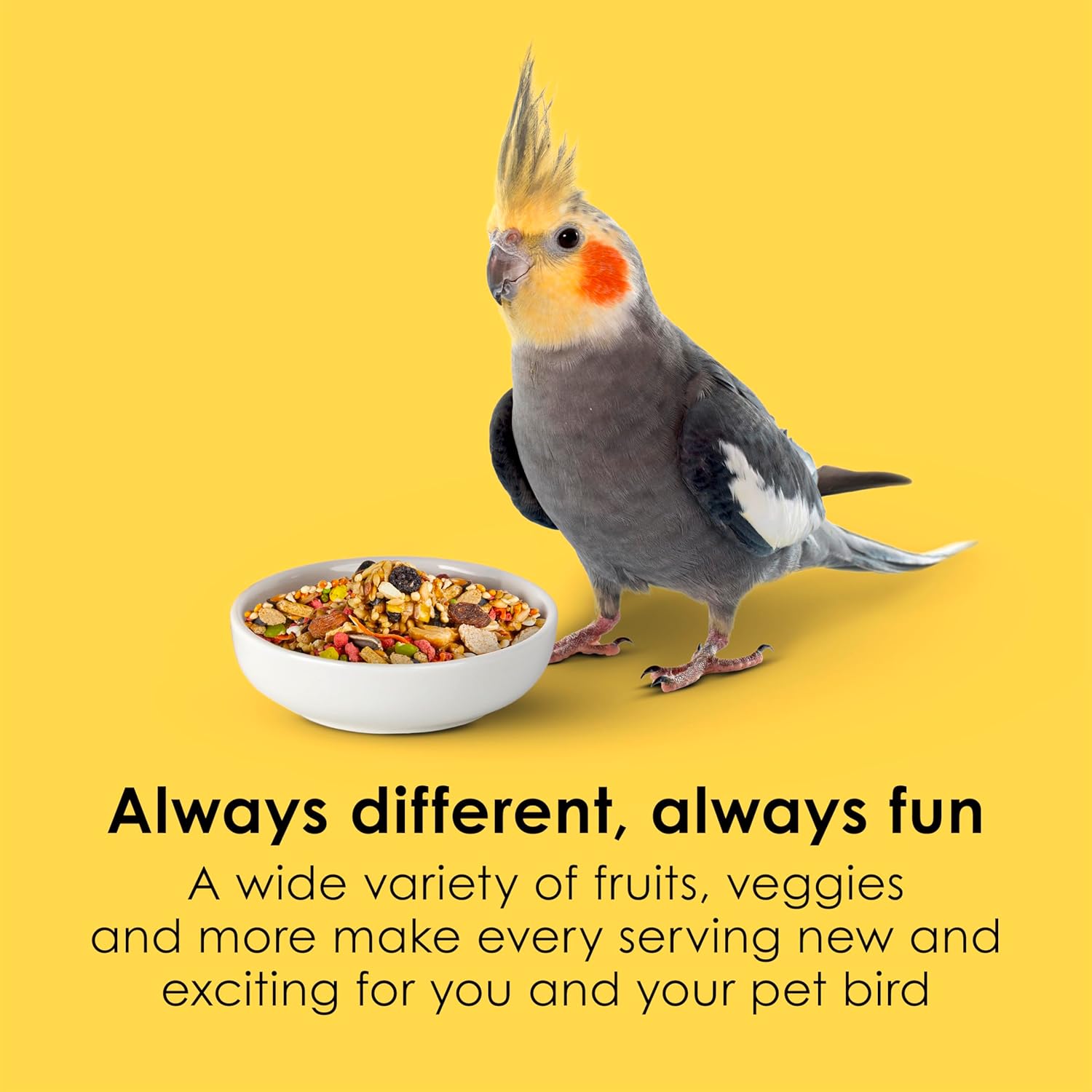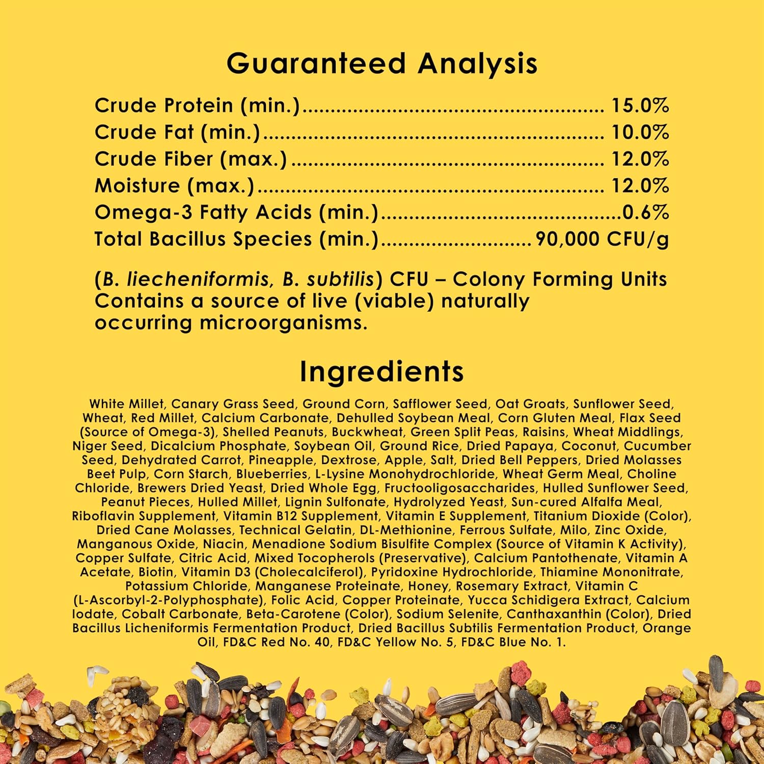 Dive into a delightful mix of seeds, grains, fruits and vegetables like papaya, coconut and carrots to make every bite exciting and nutritious! The party of shapes and textures encourages natural foraging behavior, helping beat boredom and alleviate stress.